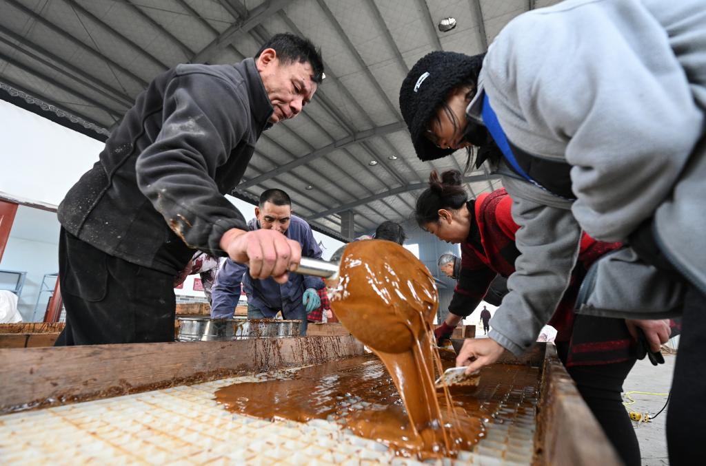 12月20日,積善村村民將紅糖倒入模具中。每年冬至前後,福建省將樂縣積善村的村民都會忙着收割甘蔗,熬製紅糖。對村民來説熬製紅糖是祖傳的民俗手藝,也是對甜蜜生活的美好寄託。新華社記者 周義 攝