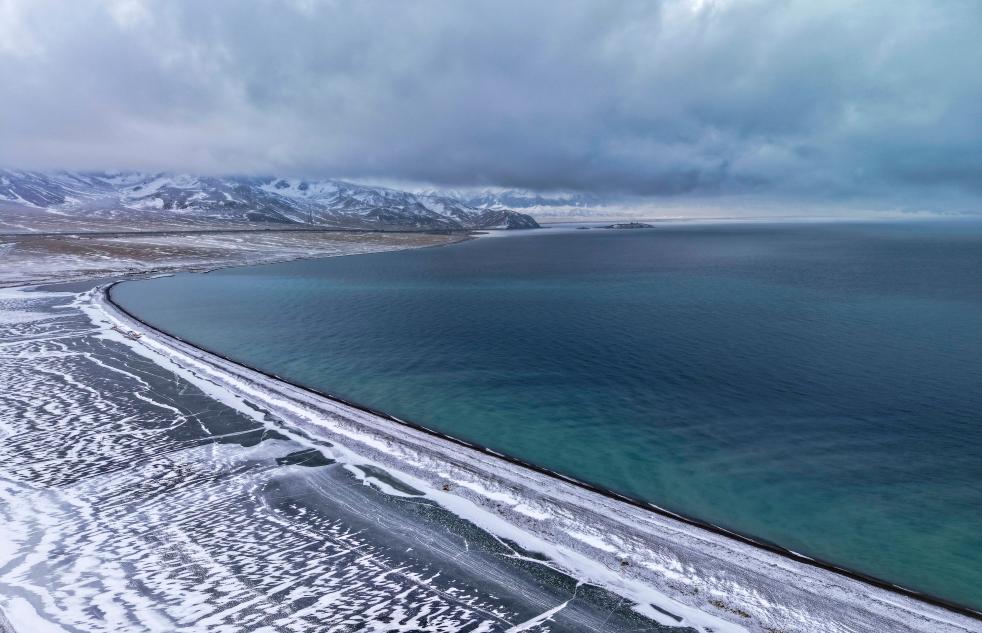 近日拍攝的賽裏木湖和雪山(無人機照片)。新華社發(徐銳 攝)