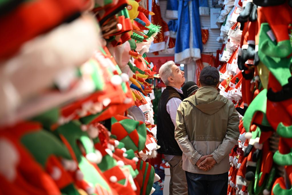 在另一家店舖,店員艾梅談起轉型之路。“我們原先經營倣真花業務,隨着市場需求變化,察覺到節慶用品的巨大潛力,便在2024年果斷切換賽道。”艾梅説,得益於中國製造業完整成熟的産業鏈,工廠設計開發出數百類玩偶、擺件等産品,從設計和用料等方面,瞄準中高端市場。