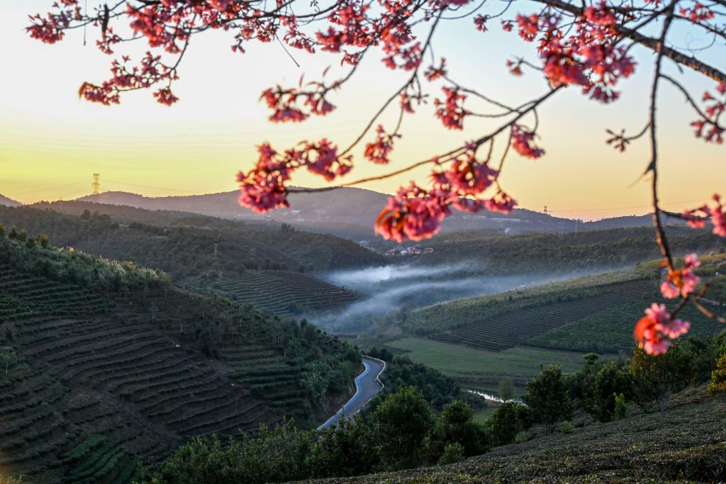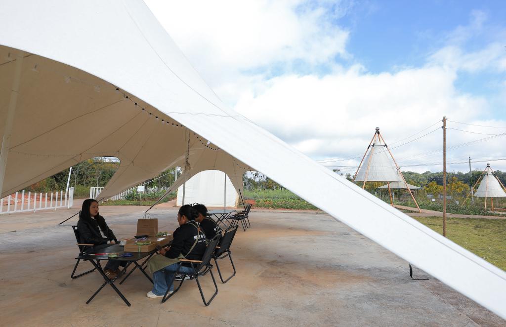 游客在大渡崗鄉“熱土工作室”品嘗當地村民製作的櫻花主題茶飲和咖啡。