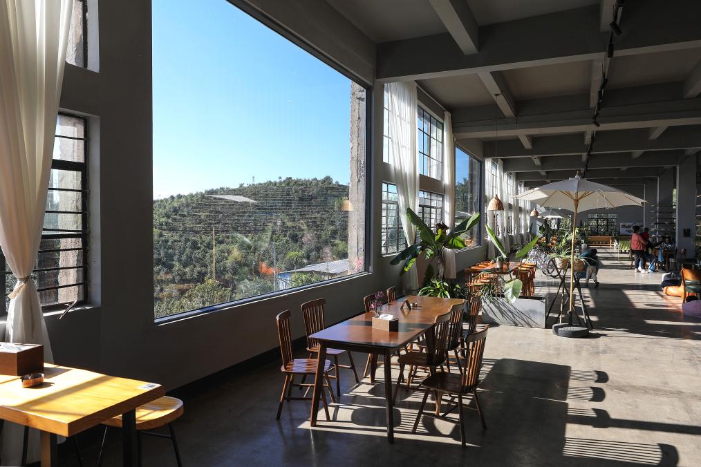 游客在大渡崗鄉“熱土工作室”品飲咖啡、打卡拍照。