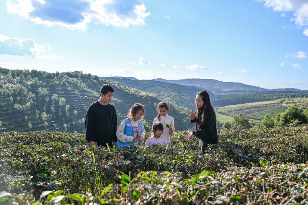 魏春(右一)帶領小朋友在大渡崗鄉的茶園裏研學。