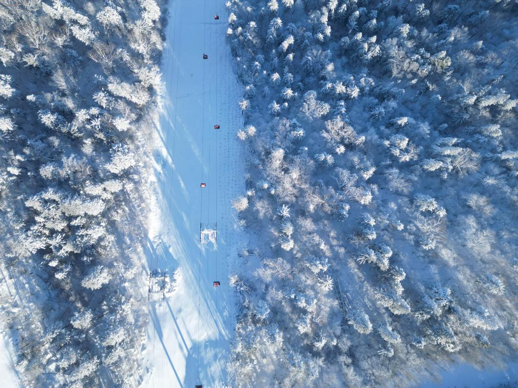 這是2025年12月2日在吉林市北大湖滑雪度假區拍攝的由北京起重運輸機械設計研究院和徐州天馬索道纜車設備有限公司共同研發生産的纜車。據介紹,北大湖滑雪度假區的纜車國産化達90%以上。