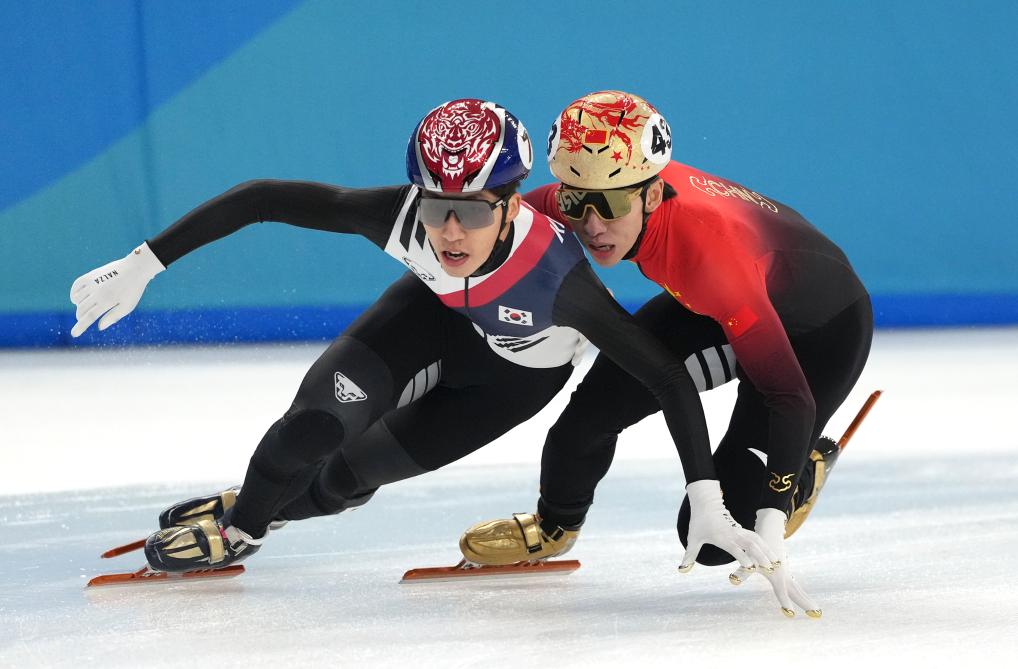 2025年2月9日,中國隊選手林孝埈(右)、韓國隊選手樸智元在比賽中發生身體碰撞。當日,在哈爾濱舉行的第九屆亞冬會短道速滑男子5000米接力A組決賽中,中國隊獲得季軍。