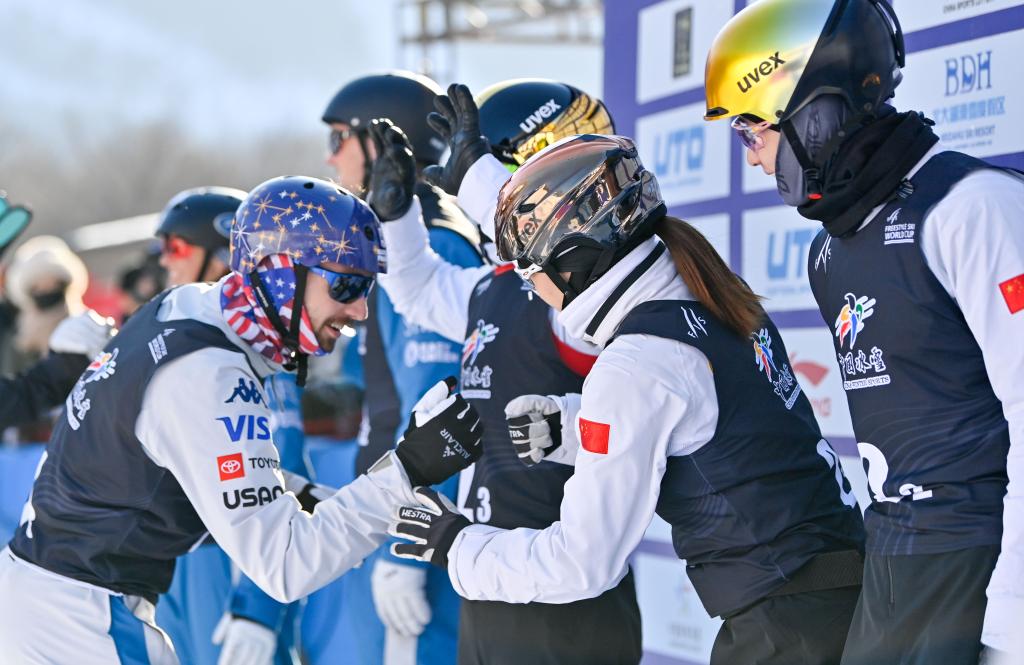 2025年2月24日,美國選手克裏斯托弗·利利斯(左一)與徐夢桃(右二)在比賽後相互致意。
