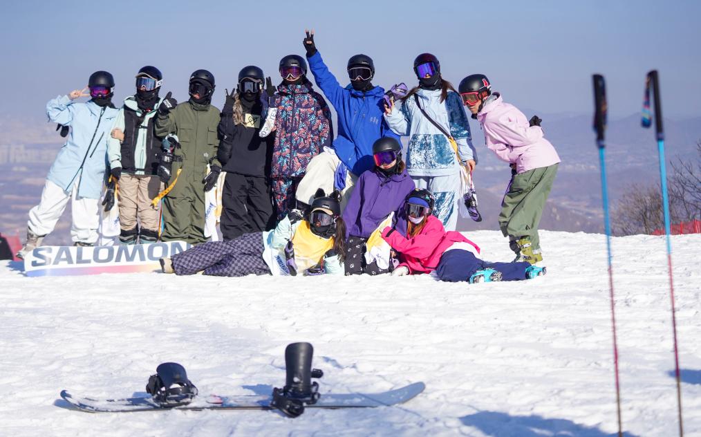 2025年11月22日,滑雪愛好者在吉林市中旅松花湖度假區合影留念。