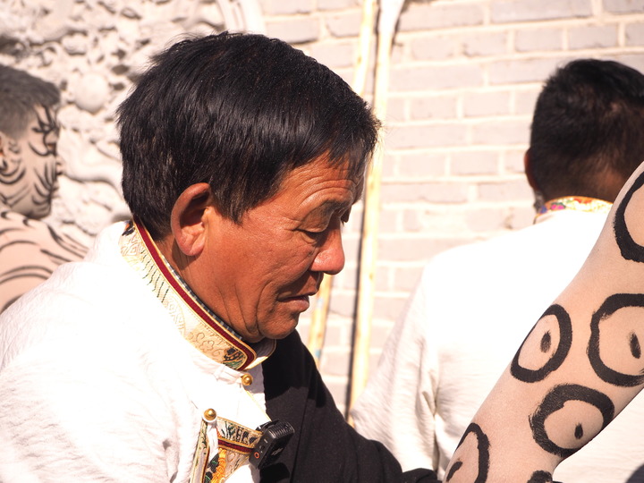 國家級非遺代表性傳承人阿吾在給“於菟”儀式參與者繪製圖騰。新華社記者 白瑪央措 攝