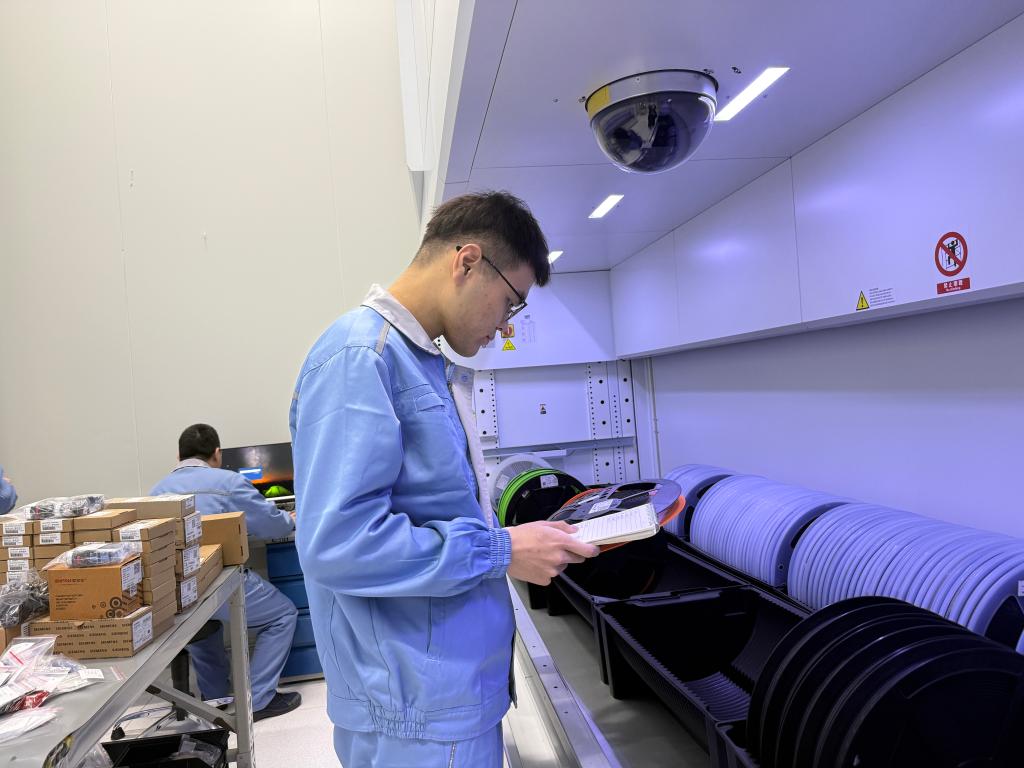 近日,在交控技術裝備有限公司的智能生産車間內,工作人員正在核對出庫物料。新華社記者 徐思鈺 攝