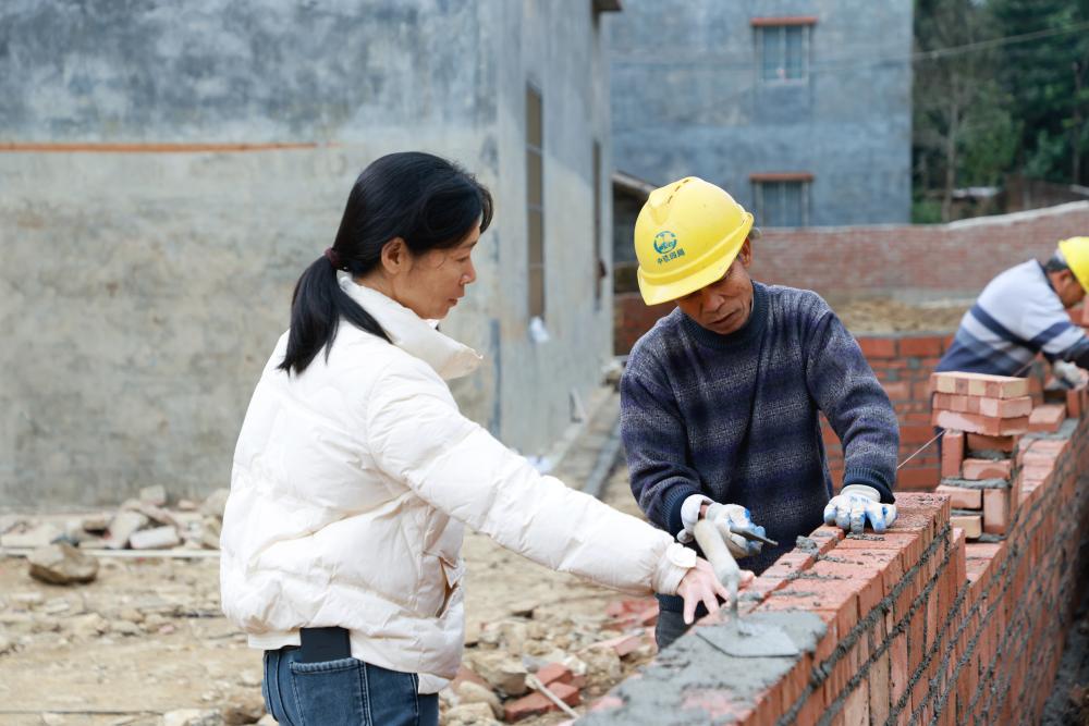中和村黨支部書記劉名芳(左)查看村裏新修設施的進展情況。
