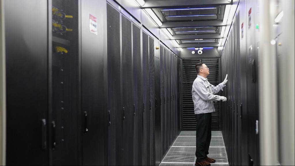 2025年5月20日,工作人員在中國移動智算中心(呼和浩特)機房中維護設備。新華社發(蘇雅立攝)