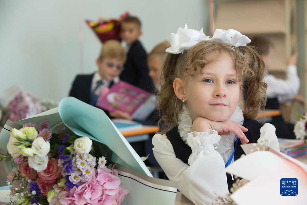 9月1日,學生們在俄羅斯聖彼得堡一所學校內等待上課。