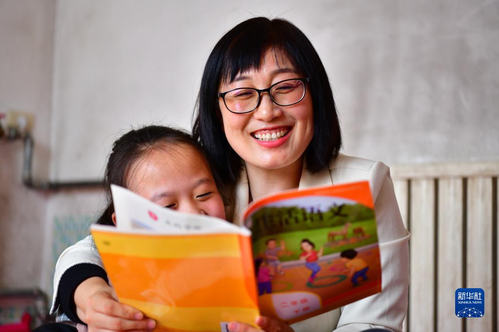 10月13日,在海興縣香坊鄉北王村,張余敏(右)在為一名學生讀課文。