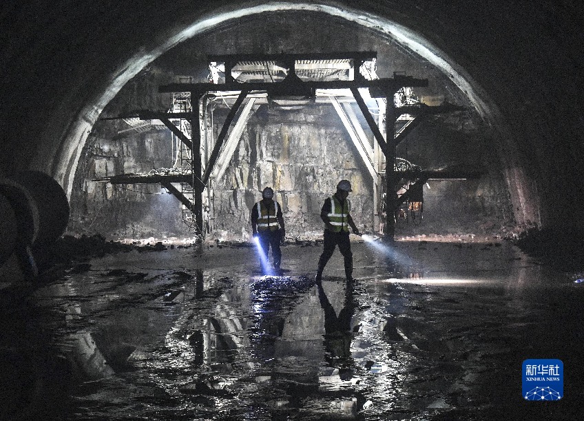 在新建的防城港至東興鐵路銅鼓嶺隧道內,工人進行現場安全巡查(10月20日攝)。