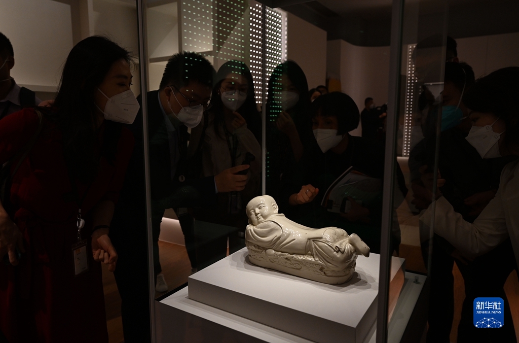這是即將展出的北宋定窯白釉孩兒枕(6月9日攝)。