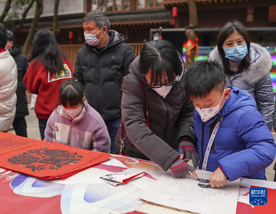 1月17日,市民在南昌市百花洲八一公園的“迎新春 送祝福”活動上製作木板年畫。