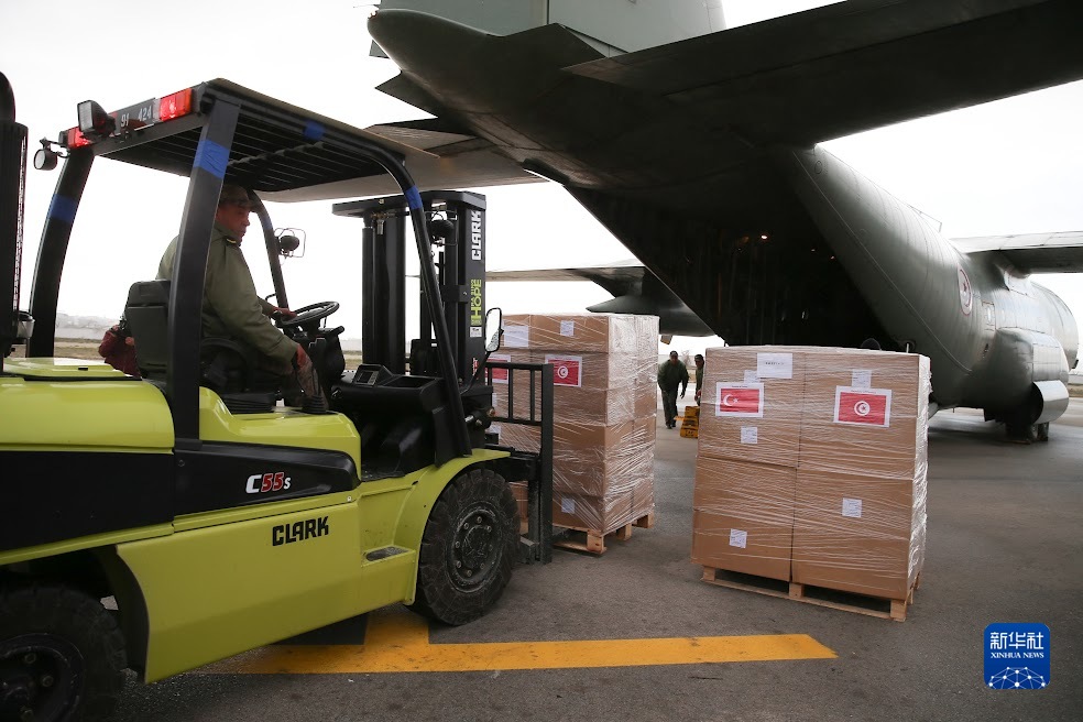 2月7日,工作人員在突尼斯迦太基國際機場裝載救援物資。突尼斯政府當日向土敘兩國分別派出醫務、救援人員並提供救援物資。