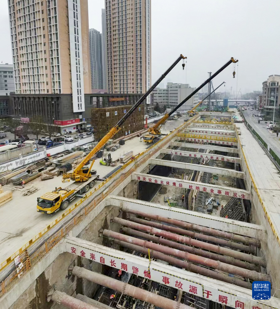 在天津地鐵8號線一期工程5標項目湘江道站至土城站區間明挖停車線現場,大型機械在吊運施工裝備(2月11日攝,無人機照片)。