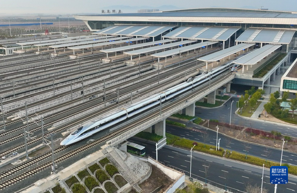 2月15日,一列動車組列車駛出湖北襄陽東站(無人機照片)。