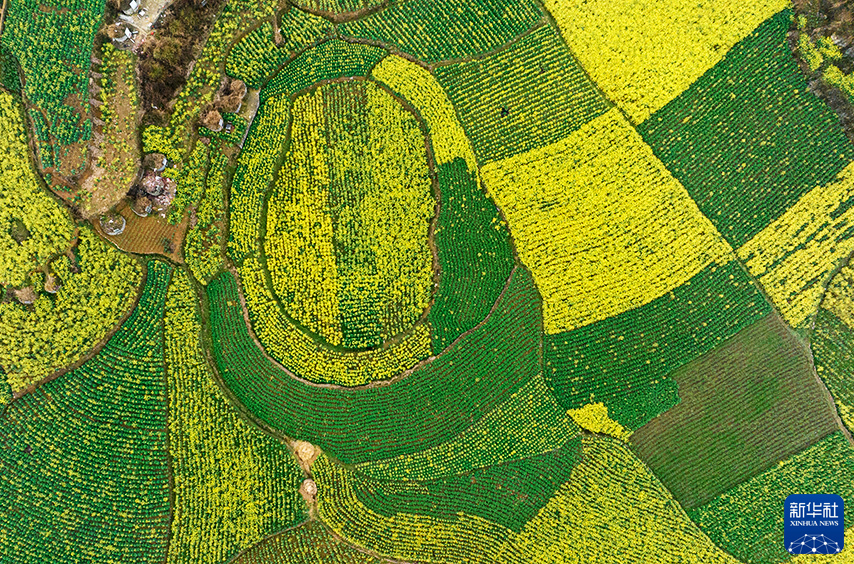 2月17日拍攝的貴州省六盤水市六枝特區木崗鎮萬畝油菜基地(無人機照片)。