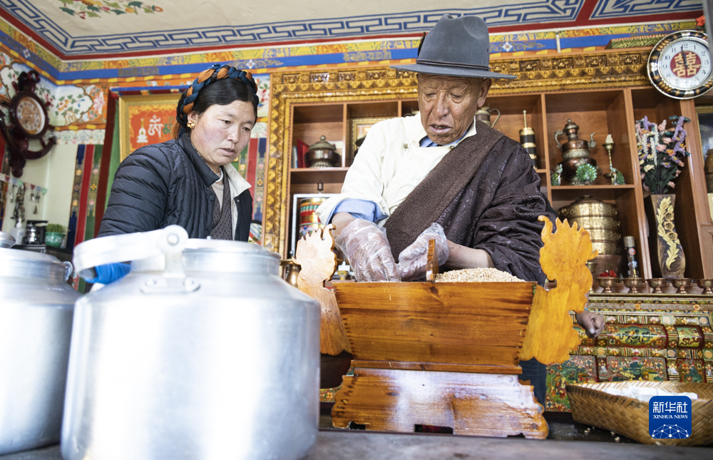 2月20日,在位於西藏拉薩市墨竹工卡縣門巴鄉的家中,扎西次仁(右)和家人在製作象徵吉祥的“切瑪”。