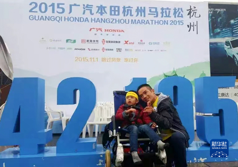 羅書堅(右)推着兒子小柏參加完杭州馬拉松7公里項目後留影(2015年11月1日攝)。
