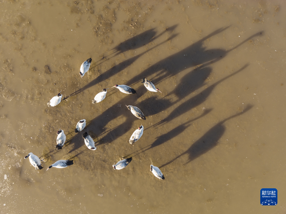 這是在拉薩市林周縣卡孜水庫拍攝的黑頸鶴(3月1日攝,無人機照片)。