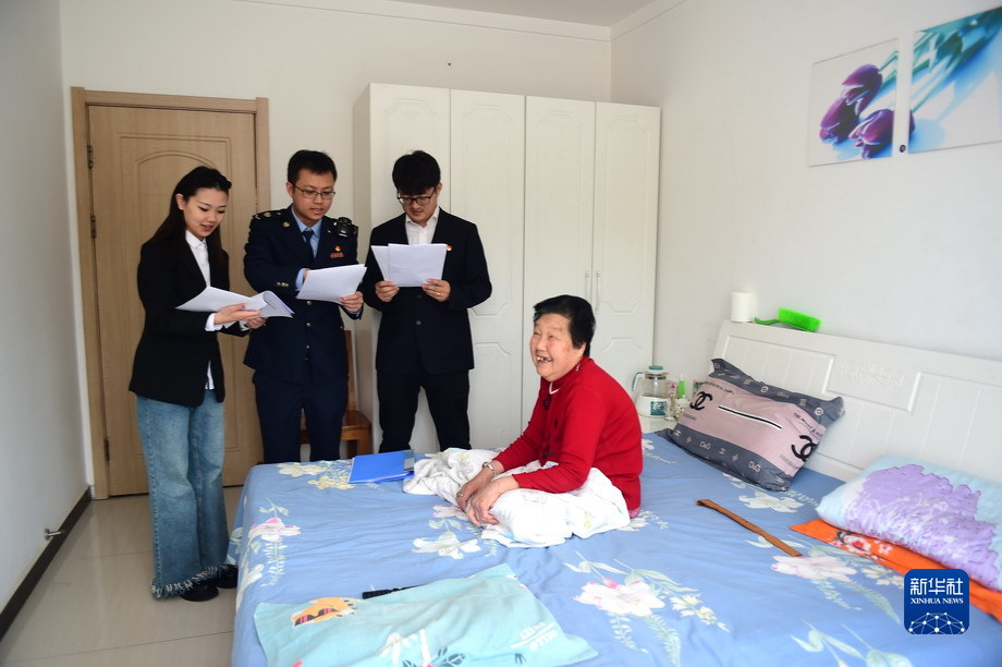 3月13日,國家稅務總局青縣稅務局的工作人員(後中)與住房和城鄉建設、自然資源和規劃職能部門的工作人員攜帶相關表證單書,上門為88歲行動不便的老人劉長俊,辦理房産交易業務。新華網 發(劉一瑋 攝)