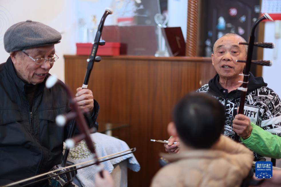 3月29日,錢福基(左)、錢建平(右)和家人在江蘇無錫家中合奏二胡。
