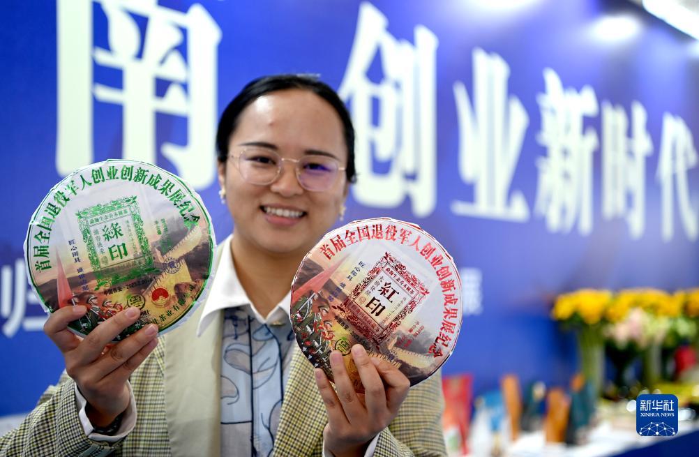 3月30日,首屆全國退役軍人創業創新成果展交會現場,一名參展人員展示為展會特製的紀念茶餅。