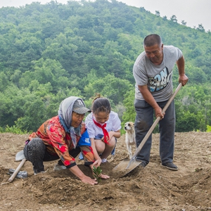 田萬貴、陸敏夫婦和小朋友在遼寧省凌海市翠岩鎮前田屯村“鷺嶺”植樹(2022年6月3日攝)。