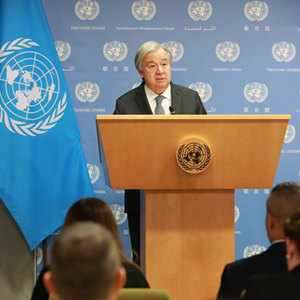 5月17日,在位於紐約的聯合國總部,聯合國秘書長古特雷斯(後)在記者會上講話。
