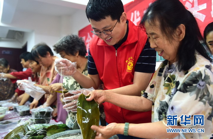 6月20日,河北滄州市運河區紀委監委工作人員與雙金社區居民共同包起“廉心粽”。新華網發(謝辛 攝)