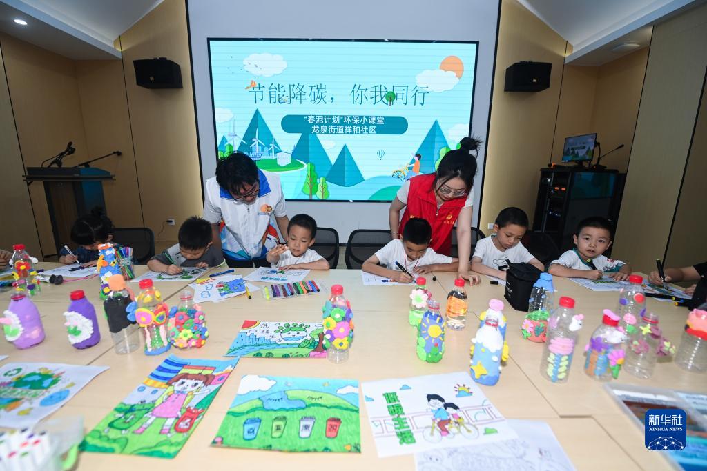 7月11日,小朋友們在浙江省湖州市吳興區龍泉街道祥和社區參加低碳主題繪畫活動。