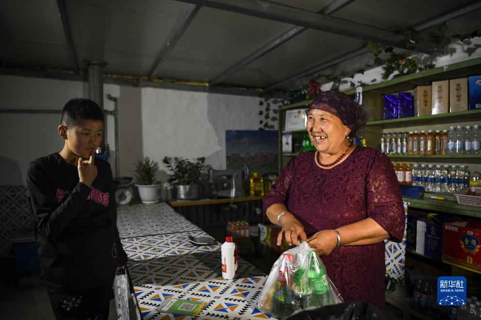 巴哈提在家中給前來買東西的顧客打包商品(7月2日攝)。與父輩們單一的放牧不同,巴哈提家的收入來源日益多元化。