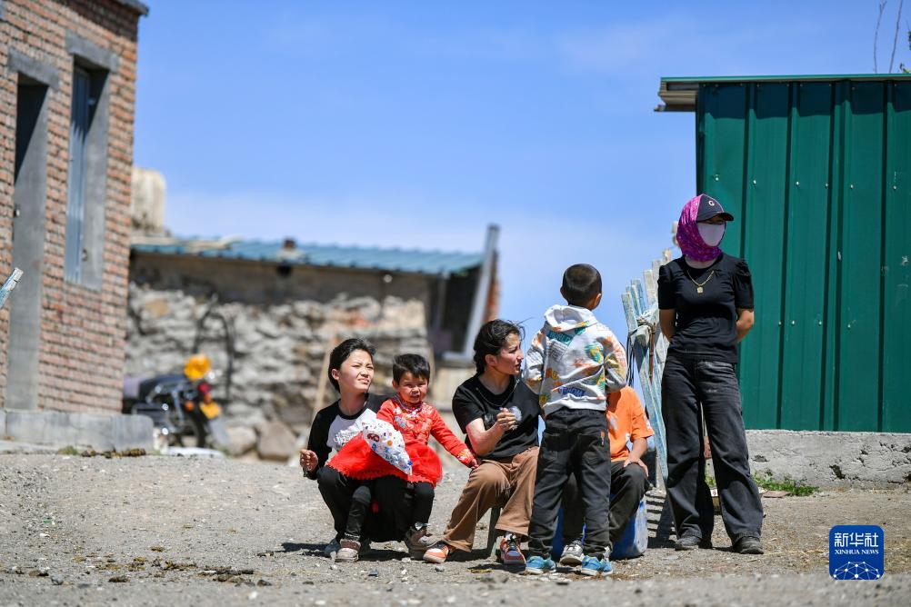 哈布得拉什麼趕着羊群離家後,他的大女兒加孜拉(右一)、小女兒昆樹阿克(左三)和侄女(左一)、孫輩們齊齊望著轉場人群遠去的方向(7月3日攝)。