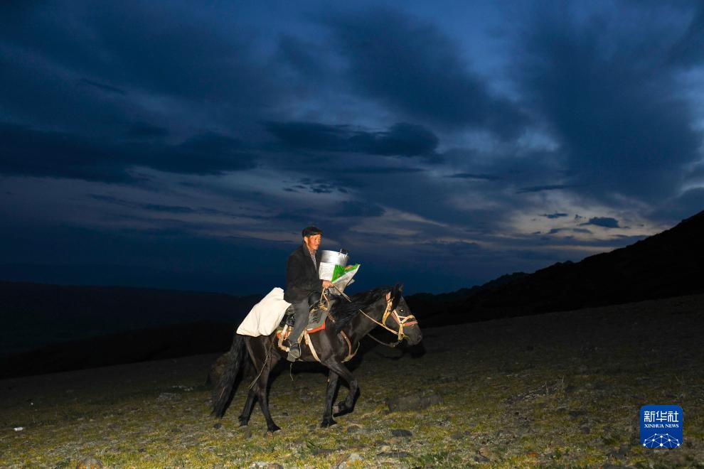 由於坡度太大,汽車無法攜帶物品抵達露宿營地,哈布得拉什麼只好騎馬轉運(7月3日攝)。