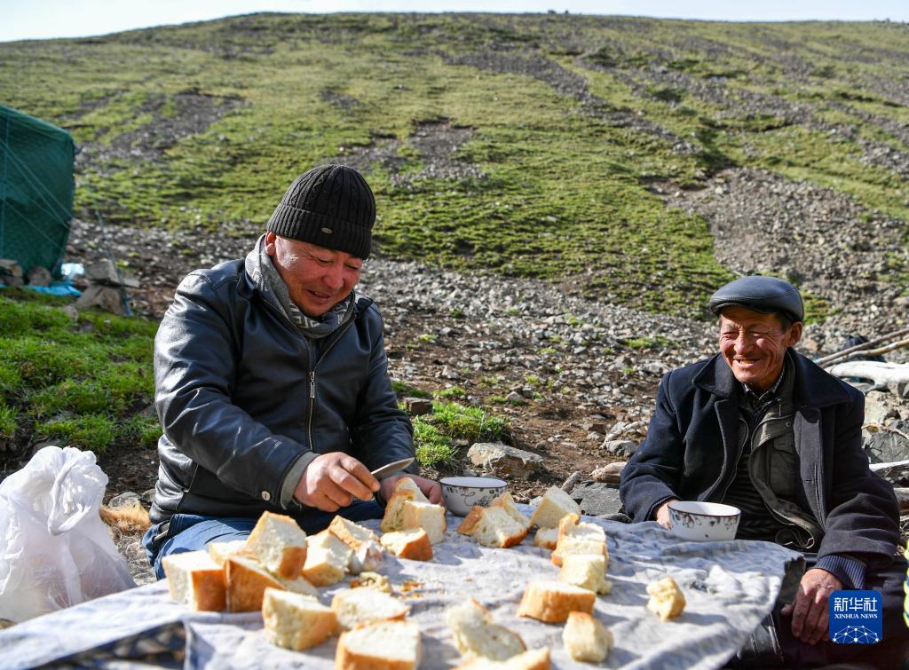 哈布得拉什麼(右)在夏牧場上吃早餐(7月4日攝)。桌上的塔巴馕是妻子巴哈提提前在家中烤制好的。