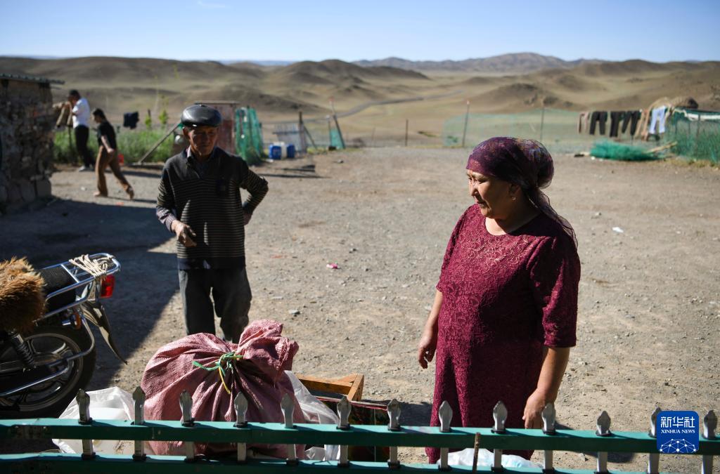 巴哈提和丈夫在門前小院內商量轉場需要攜帶的物資(7月3日攝)。