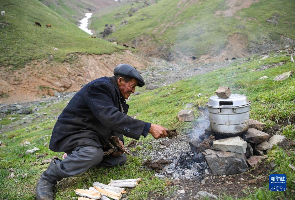 哈布得拉什麼在夏牧場上燒茶(7月4日攝)。