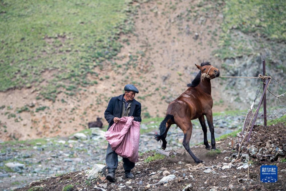 第二天,轉場隊伍又經過六個多小時的跋涉,抵達夏牧場,哈布得拉什麼撿拾牛糞用作燃料(7月4日攝)。