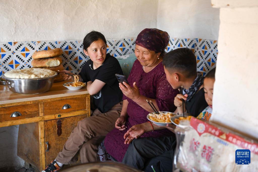 巴哈提(左二)和小女兒昆樹阿克(左一)、侄子寨桑(左三)在家中聊天休息(7月3日攝)。