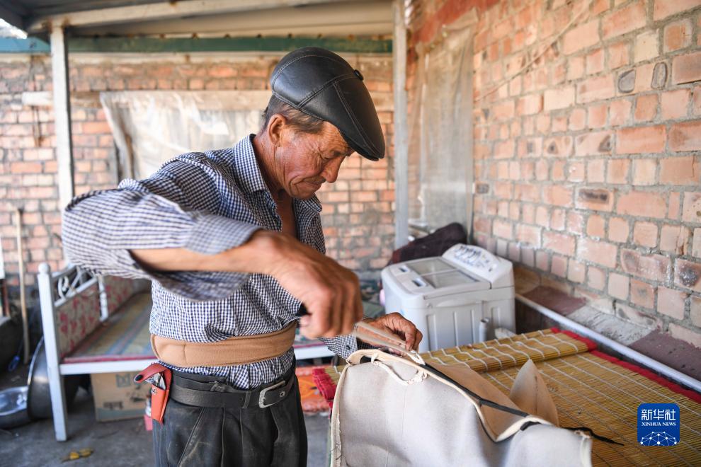 哈布得拉什麼在家中整理用於轉場時裝貨的布袋(7月2日攝)。