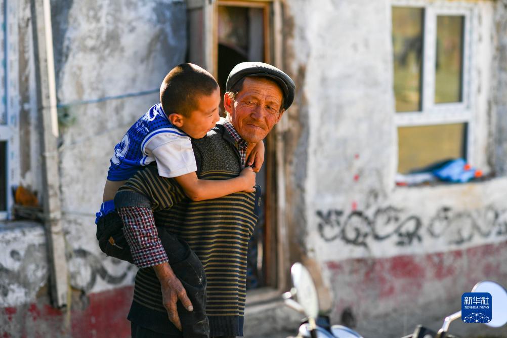 轉場出發前,哈布得拉什麼背着小外孫巴哈卓力玩耍(7月3日攝)。轉場時,親友們前來幫忙,也是一次難得的短暫相聚。