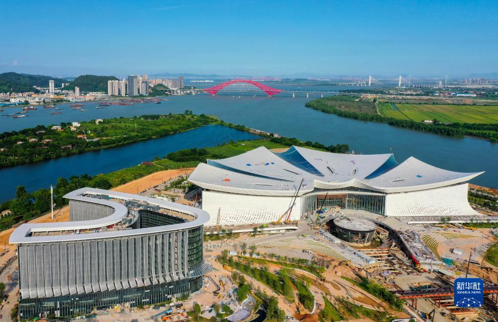 空中俯瞰位於廣州市南沙新區橫瀝島尖的國際金融論壇(IFF)永久會址,宛如迎風綻放的木棉花(無人機照片,7月10日攝)。