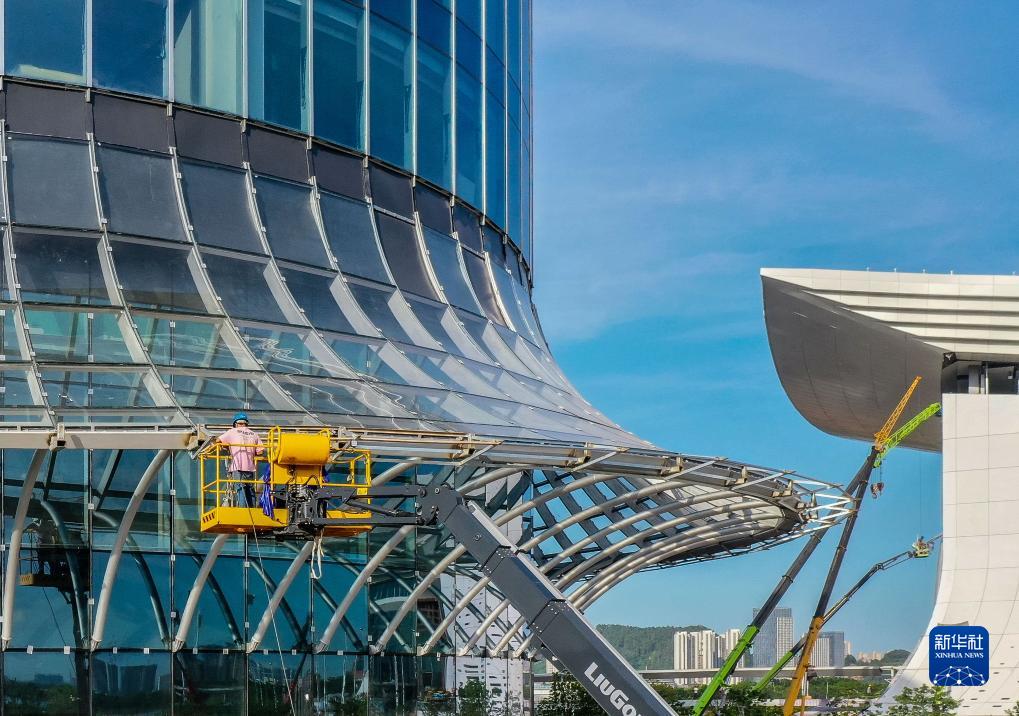 建設者在國際金融論壇(IFF)永久會址進行幕墻施工(無人機照片,7月10日攝)。