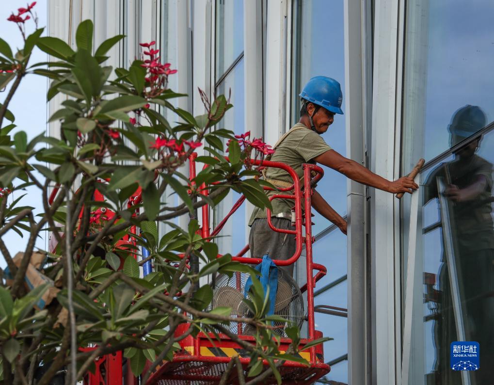 建設者在國際金融論壇(IFF)永久會址進行幕墻施工(7月10日攝)。