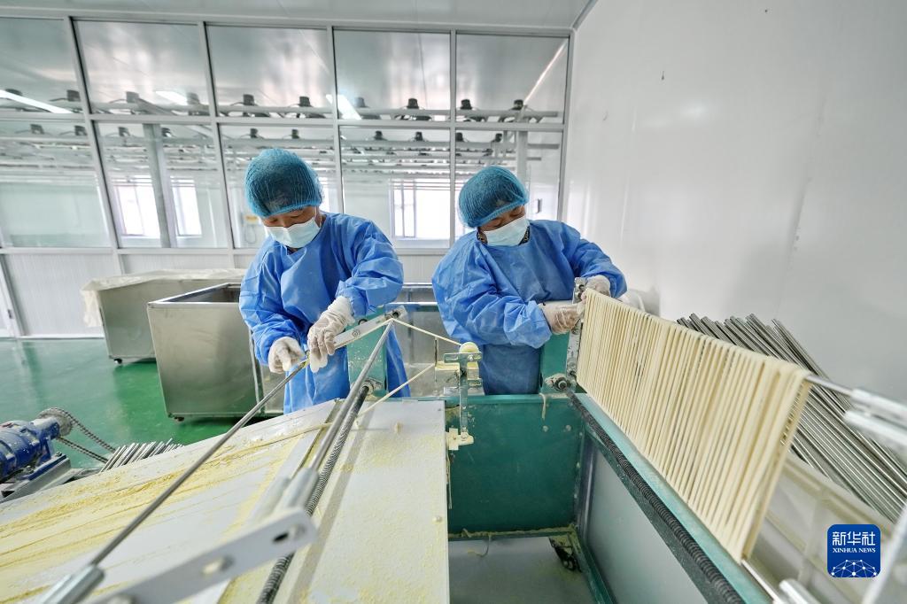 7月11日,河北省遷安市野雞坨鎮丁莊子村一家食品生産企業的工人在空心掛麵生産線上工作。