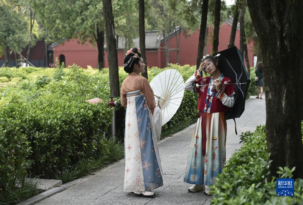 7月11日,身穿古裝的游人在洛陽市白馬寺景區游覽。
