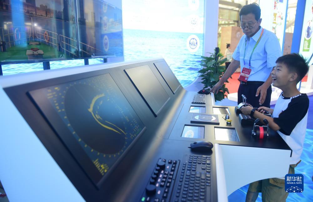 7月11日,小朋友在河北滄州舉行的2023年航海科技博覽會上模擬操作輪船。