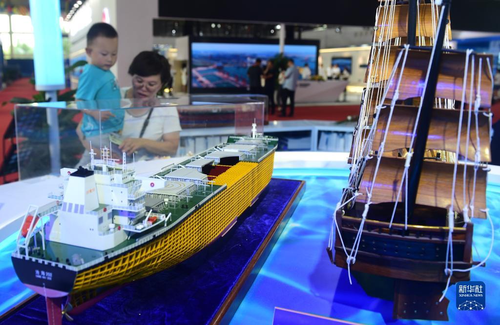 7月11日,參觀者在河北滄州舉行的2023年航海科技博覽會上了解造船技術。